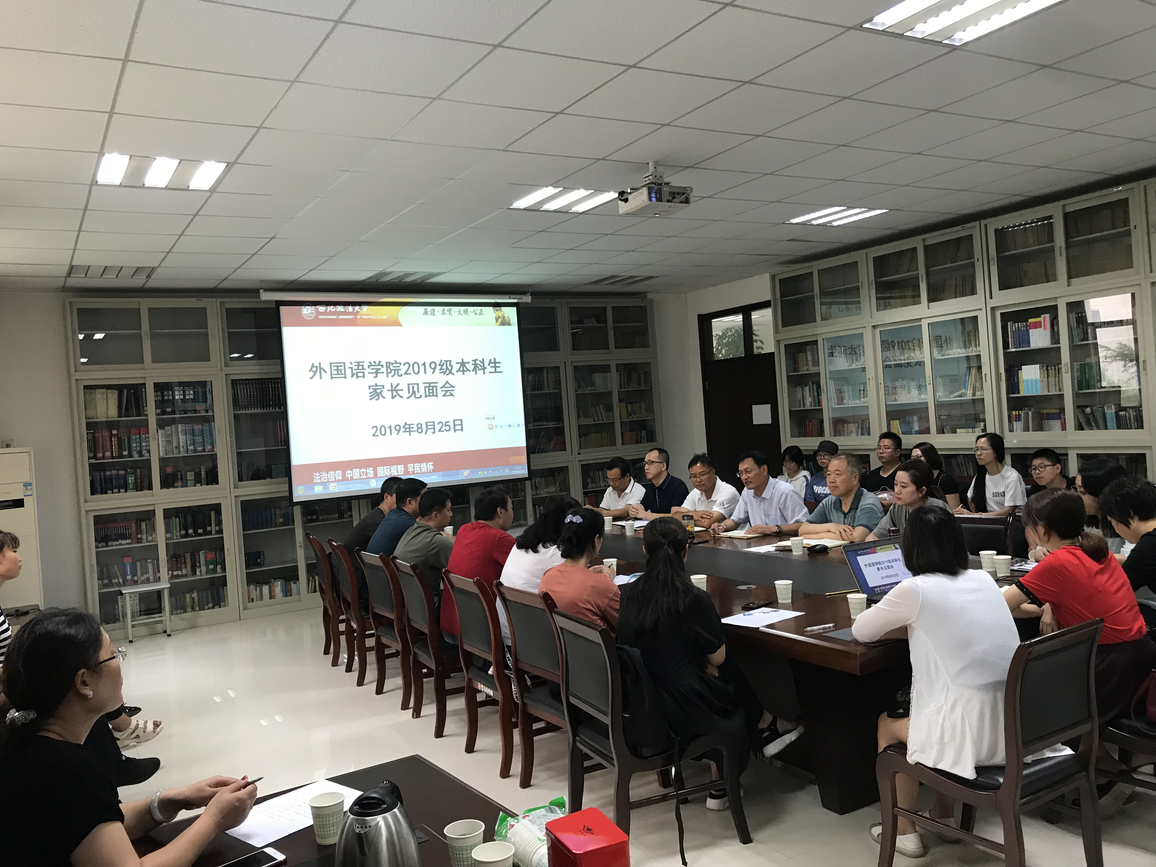 2019年8月25日上午10时整,我院2019级新生家长见面会在学院资料室顺利举行。出席见面会的有院长马庆林、党委书记姜建兴、副院长马腾、副院长陈河、党委副书记兼副院长吕凌、英语系主任樊养才、综合英语教研室主任秦婷、商务英语系副主任王颖平、法律英语教研室主任付巧、2019级辅导员吴晓娟以及部分2019级本科生家长及新生,共计50余人。