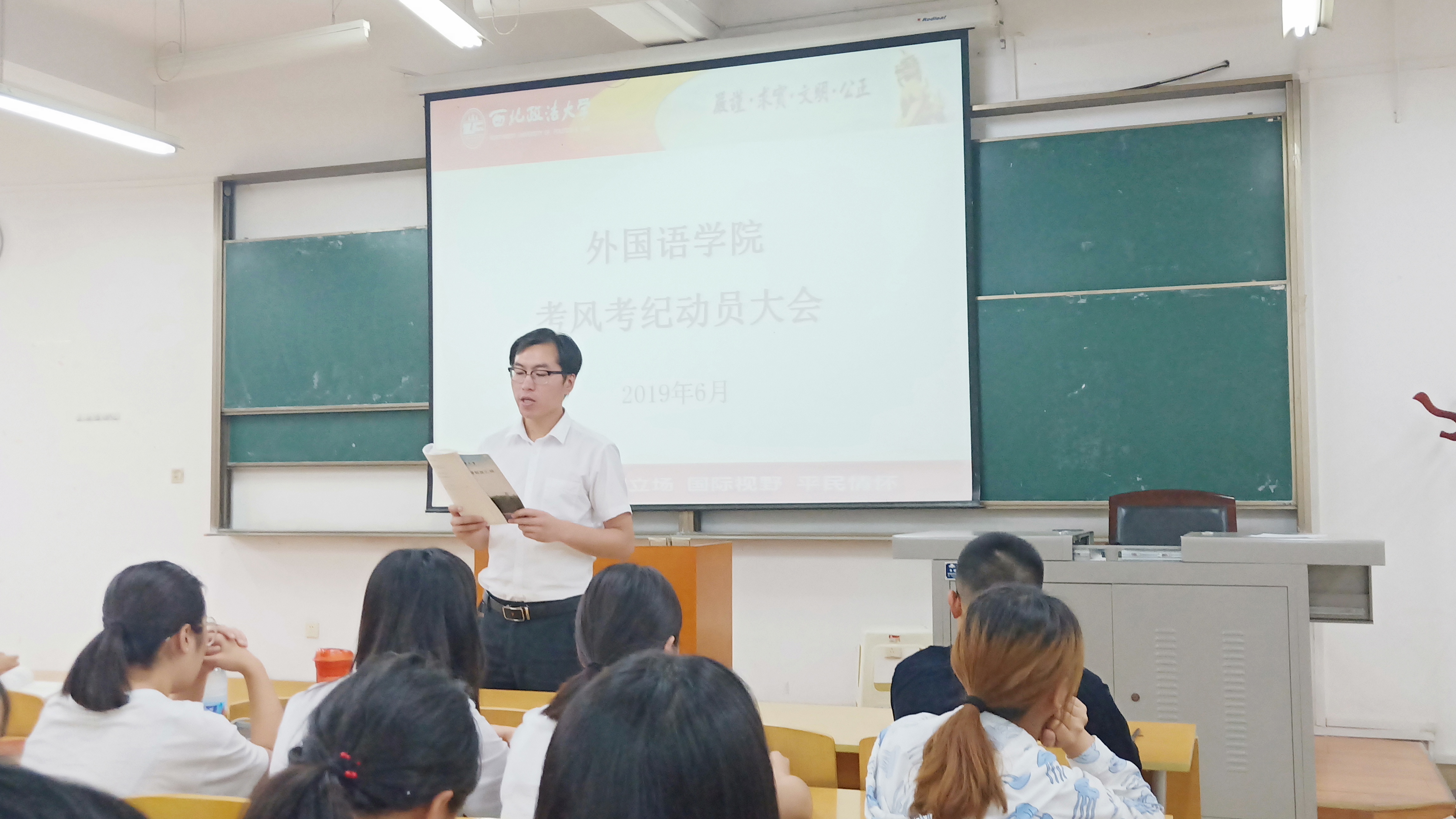 为落实好我院期末考试工作,严肃考风考纪,提高考试质量,外国语学院于6月28日上午在BJ12举行了考风考纪教育大会。2016级、2017级、2018级三个年级学生及各年级辅导员共计300余人参加了此次会议。大会由必赢线路检测3003no1团委书记秦立主持。