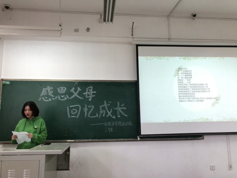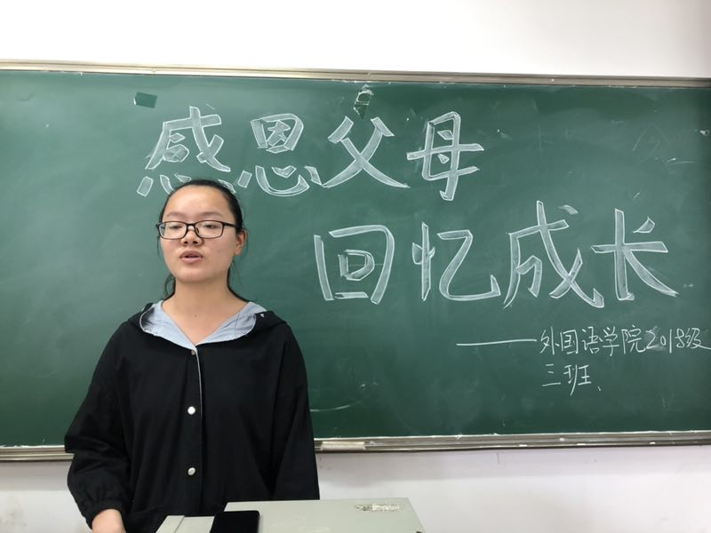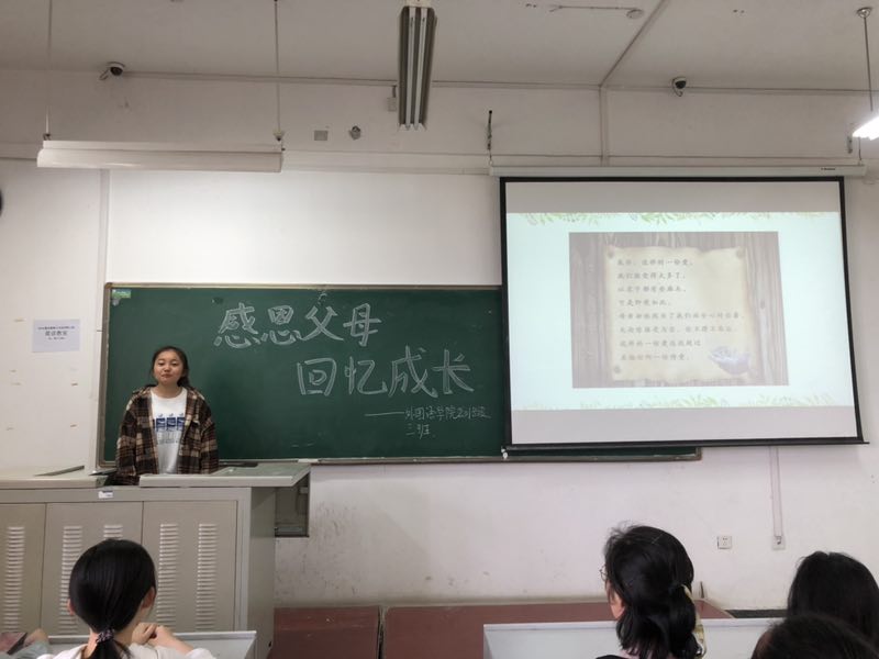 视频结束后几位同学有感而发,上台分享自己的感想。程晓文同学讲述自己与父母之间的故事。她说,我们应该对父母心存感恩,父母对我们的爱是无私的,不求回报的,我们不能将父母的爱当成理所当然,应该用自己力所能及的方式去回报父母,哪怕是一句问候、一通电话、一份小礼物。最后她并呼吁大家用实际行动来表达自己的感恩之情。李怡杰同学以诗歌朗诵的形式表达对父母的爱,她朗诵《感恩父母》声情并茂,令人动容。王紫玉同学则跟大家讲了一下感恩的由来以及表现,从中还举出了一些例子,如有些人因为一些事情想不开而采取一些极端的做法,甚至不爱惜自己的生命,这些人也就谈不上感恩了,所以,珍爱自己的生命也是在感恩父母。