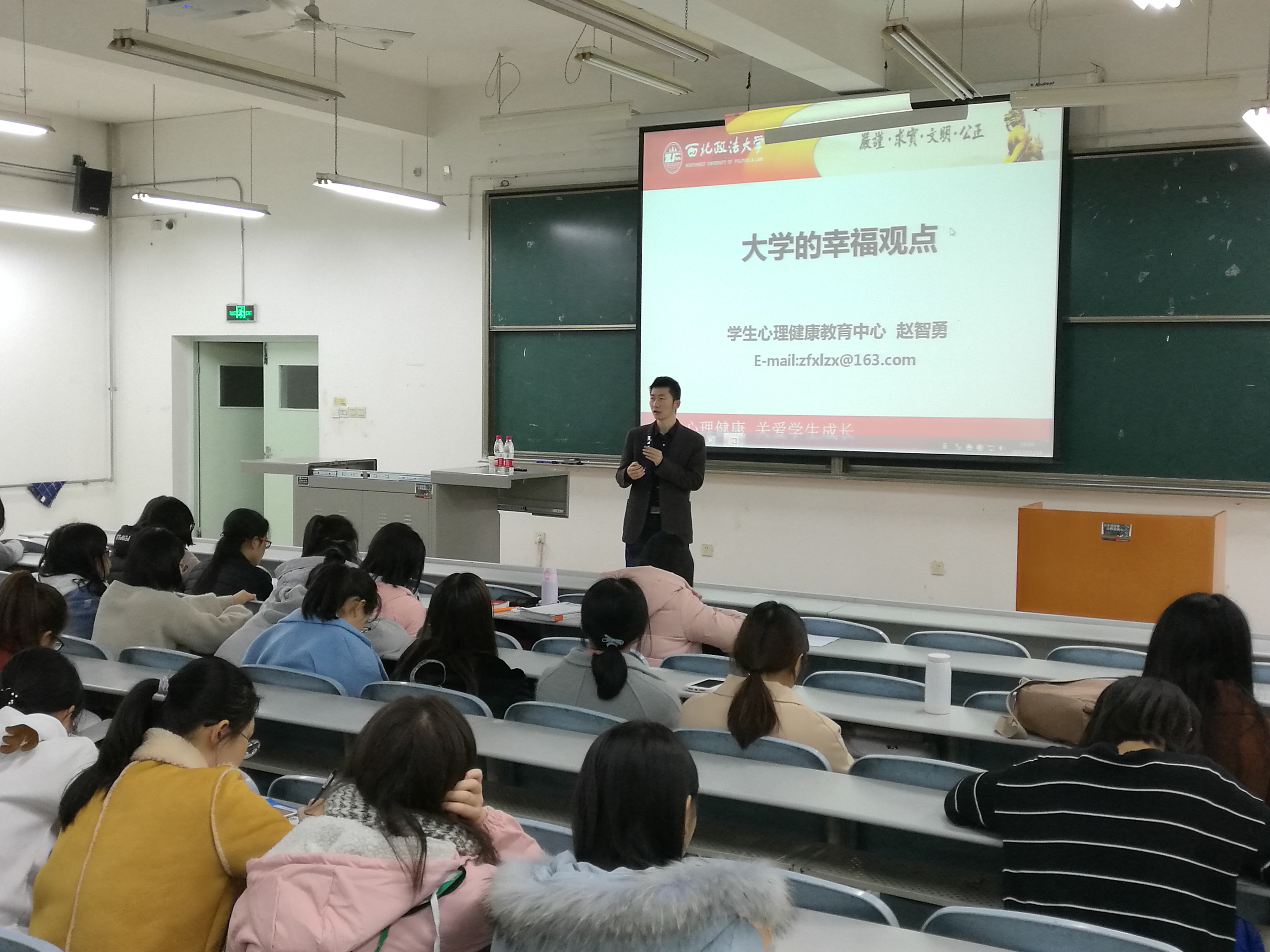 11月14日晚19:30,必赢线路检测3003no12017级新生心理健康教育讲座在天平楼AJ22教室举行。学院邀请到学工部心理健康教育中心赵智勇老师作题了“大学的幸福观念”的主题讲座,辅导员席捷老师以及全体新生参加讲座。
