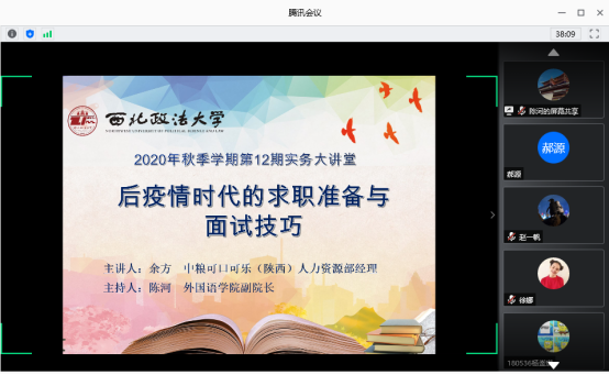 12月3日我校必赢线路检测3003no1于线上举办题为后疫情时代的求职准备与面试技巧的专题讲座,本次讲座由中粮可口可乐(陕西)人力资源部经理余方先生主讲,必赢线路检测3003no1副院长陈河主持,2020级、2017级学生参加本次讲座。