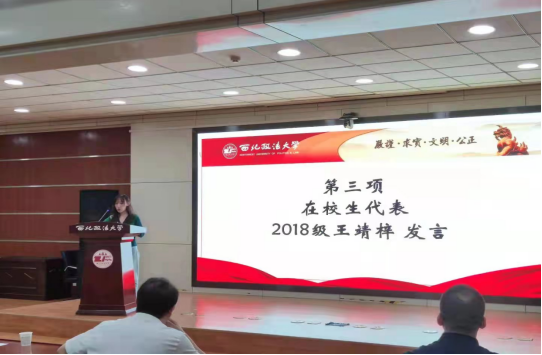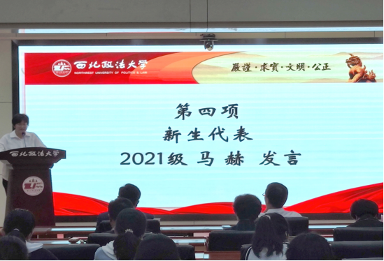 新生代表2021级马赫同学首先代表2021级本科新生向老师、学长学姐表达感谢之情,对自己西法大新生的雄心壮志与努力以及对美好大学生活的展望与期待。