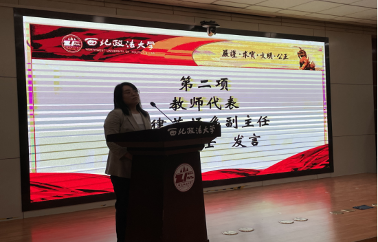 我院教师代表、法律英语系副主任付巧博士首先发言。分享自己的求学经历、导师指导,鼓励同学们从专业知识和自身能力共同提高,在大学四年中发现语言的魅力,勇攀知识高峰。