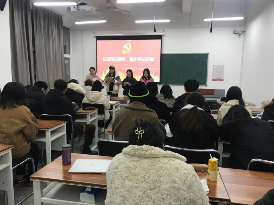 赵平同学首先向大家介绍了我国的法制宣传日、国家宪法日的来历;宪法宣传周、宪法宣传的意义;宪法的地位效力、宪法的主要内容等相关知识,希望大家能树立宪法精神、立身修德、尚法笃行。随后,刘晨、高煜凡、刘婷、白雪四位同学以“深入学习习近平法治思想,大力弘扬宪法精神”为题进行了声情并茂的演讲,通过她们的演讲,同学们深刻学习到,习近平法治思想作为科学的理论体系,是我国未来法治建设的思想灯塔和根本遵循。此外,赵海达、徐志翔、郝海卉、高博涵四位同学作了“弘扬新时代宪法精神”为主题的演讲,激励大家不断发扬新时代下的宪法精神,维护新时代宪法权威。最后,全体同学起立,向宪法宣誓,立誓自觉尊崇宪法、学习宪法、维护宪法,让宪法的阳光洒满中华民族伟大复兴的新征程!