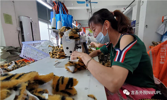 下午,团队成员来到了位于锦屏社区的玩具加工厂,参观了整个毛绒玩具的生产加工制成流程,团队成员刘晨说到:“看着叔叔阿姨们正在精心的加工着可爱、多样的毛绒玩具,更加让我体会到了财富是靠双手奋斗出来的。”随后,实践队参观了社区工厂的展品展厅,除了毛绒玩具,更有如袜子、手套等生活日用品,充分展现社区工厂贴近生活,服务生活的生产风格。同时,由于社区工厂能耗低、基本无工业污染的环保型特点,实现了当地可持续发展的工业发展模式。