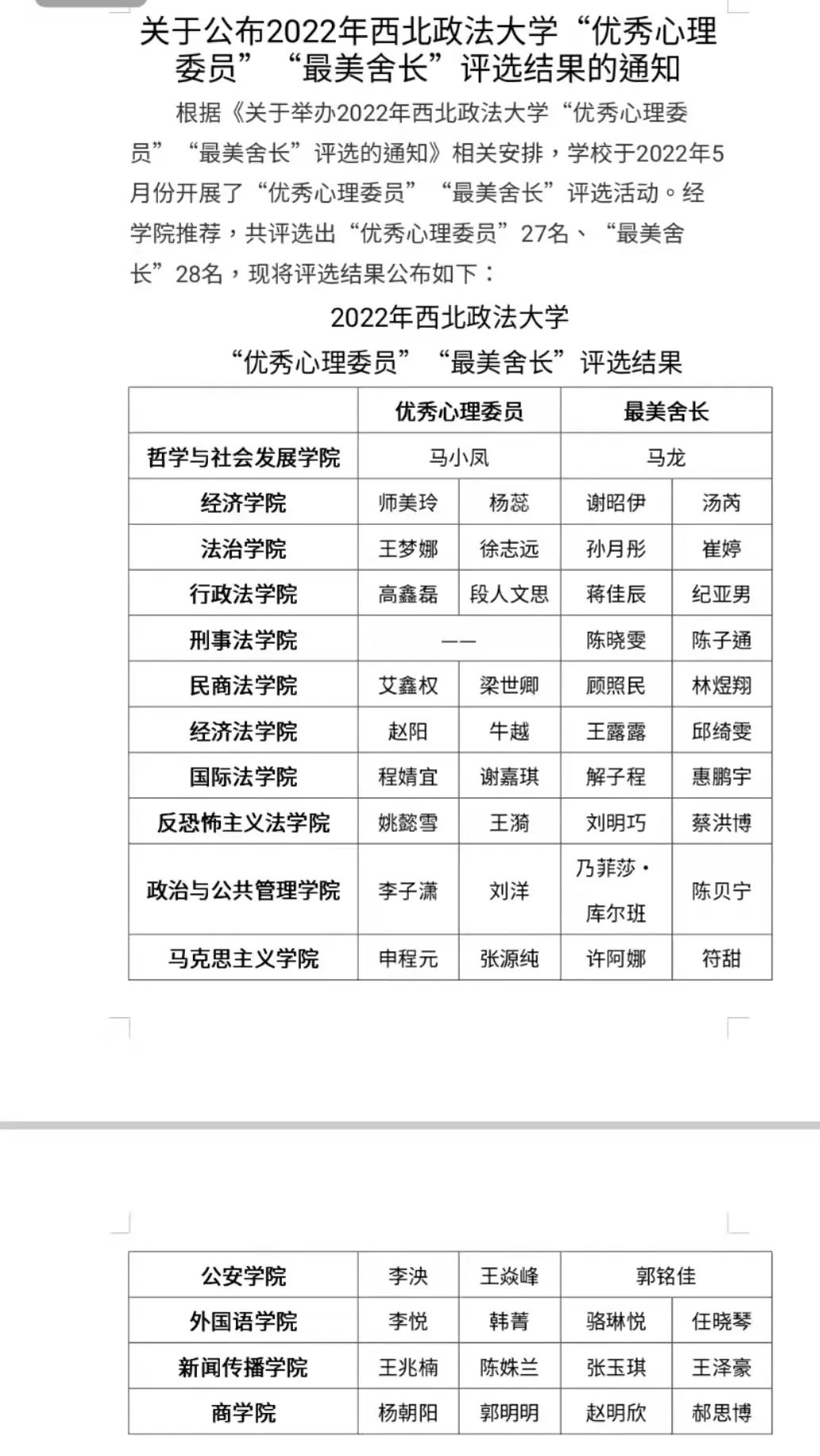 学校于2022年5月份在全校范围内开展了“优秀心理委员”“最美舍长”评选活动。经同学们申请,学院推荐,学校最终评选出“优秀心理委员”27名,“最美舍长”28名。其中我院的2021级李悦、韩菁同学荣获“优秀心理委员”称号,2019级骆琳悦、任晓琴同学荣获“最美舍长”称号。