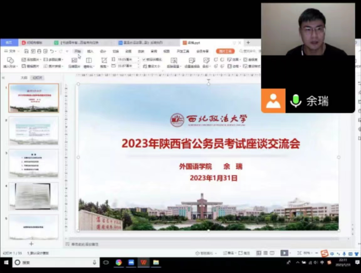 为进一步做好毕业生就业工作,落实学校就业专项行动工作安排,2023年1月31日晚,我院举办了2023届毕业生陕西省公务员考试座谈交流会,部分报考应届毕业生参加,辅导员余瑞担任主持人。