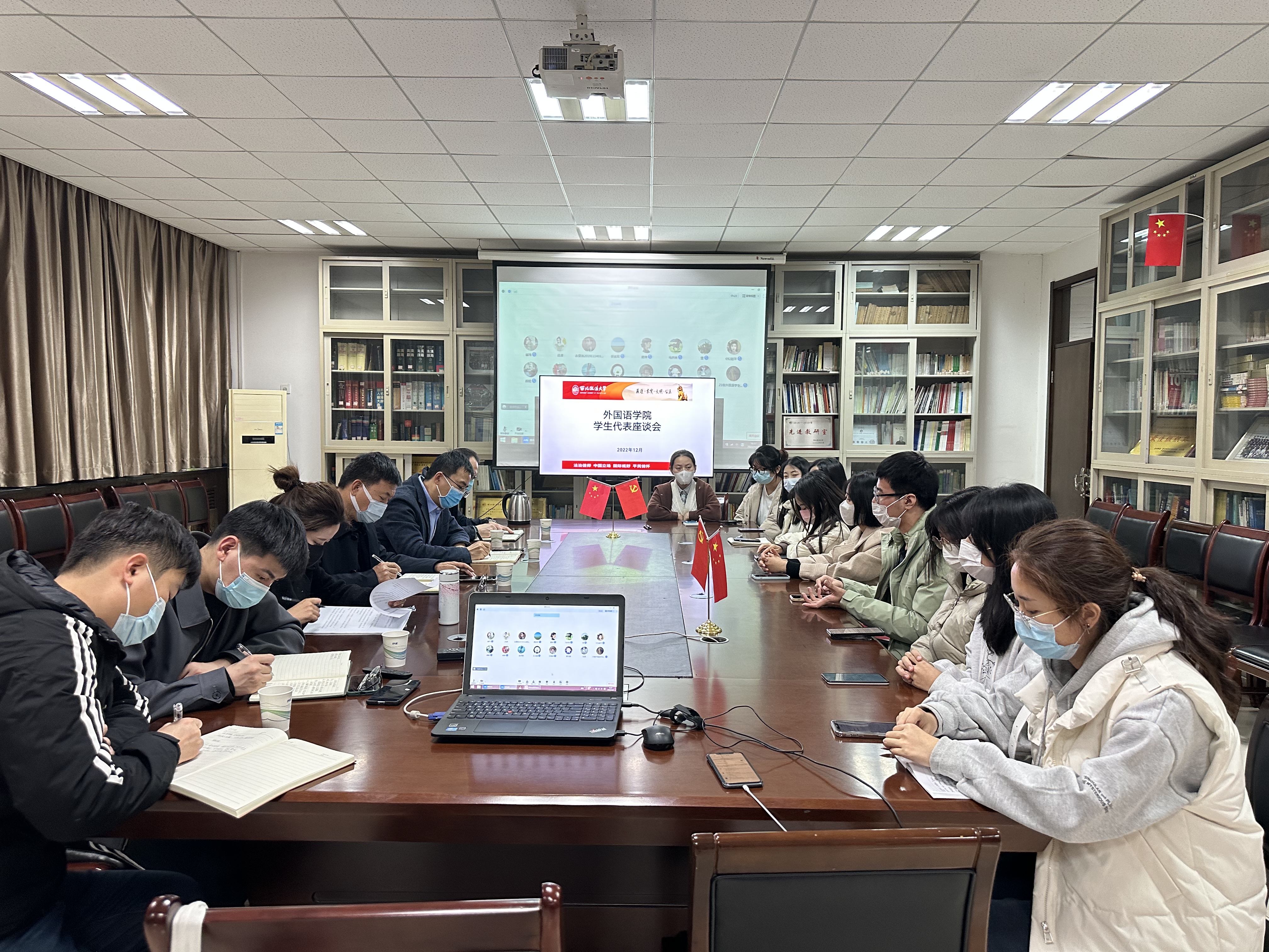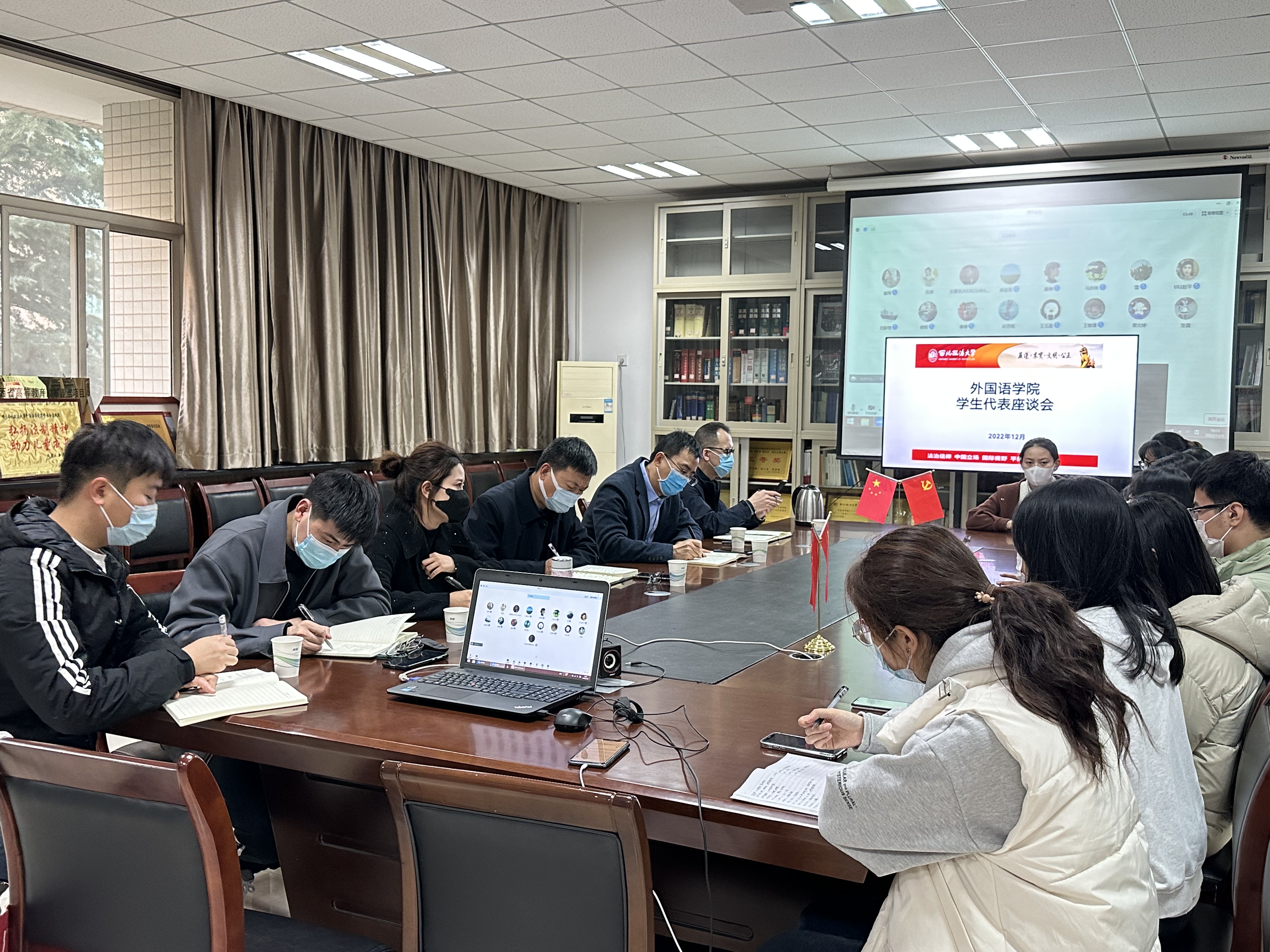 12月5日下午,必赢线路检测3003no1在学院资料室以线上线下相结合的方式召开学生座谈会。校党委副书记郭武军、学院领导班子成员、教研室主任、教师代表、教务秘书、辅导员、本科生和研究生代表参加。学院党委书记杨华主持会议。