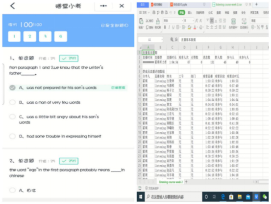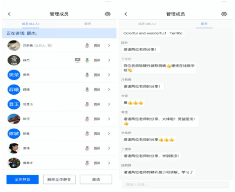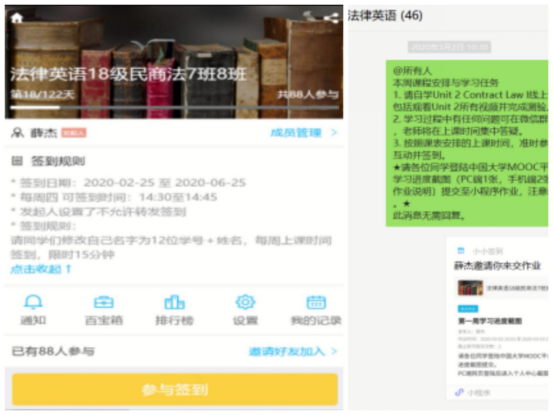 大学英语教研室的薛杰老师和霍瑛老师分别以“大学英语ESP-法律英语”“大学英语精读分级二”做了在线示范教学。本学期我校的“大学英语ESP-法律英语”课程采用“学生自学慕课+教师直播授课”的混合式教学模式,在线慕课选用“中国大学MOOC”平台的《外国民商案例选读》。薛杰老师通过腾讯会议软件展示了如何利用“超星学习通”平台进行直播授课以及在线教学的组织实施,包括在线签到、学习进度监测、线上测验、线上互动讨论、作业布置等教学任务的在线实施。霍瑛老师在延迟开学期间充分利用学院与钉钉合作研发的SPOC教学平台“云课堂”,开展了基于钉钉的“PBL+TBL”大学英语在线教学。她通过钉钉直播展示了大学英语学习资料、学生互动圈、课程思政区等在线学习板块,以及如何进行课程录播储备、掌握学生课堂参与情况和学习轨迹等在线教学手段。