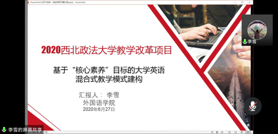 2020年6月27日晚,必赢线路检测3003no1通过腾讯会议组织召开了校级教改项目开题会,专家组由窦坤教授、杨立峰副教授、陈河副教授、马筱红副教授、刘红岭副教授五位专家组成,本年度必赢线路检测3003no1校级教改项目之一的“基于‘核心素养’目标的大学英语混合式教学模式建构”主持人李雪老师参加开题会。副院长陈河主持会议。