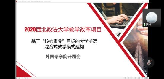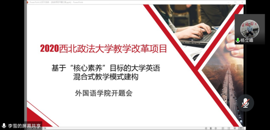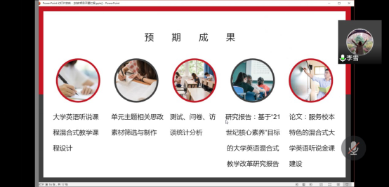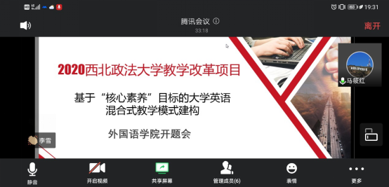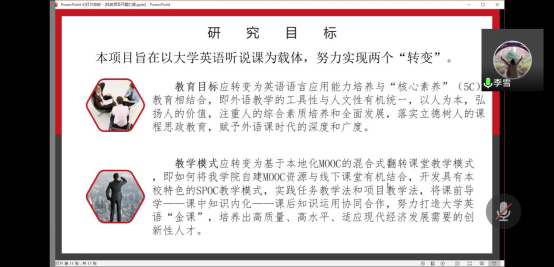 李雪老师从从研究背景与现状、研究目标、研究内容、预期成果四个模块对项目进行了详细阐述。与会专家分别从项目的研究设计、论证质量、预期成果等方面对项目开题进行了指导,并就外语教学如何培养学生“核心素养”、基于慕课的混合式教学创新等研究内容进行了深入探讨。
