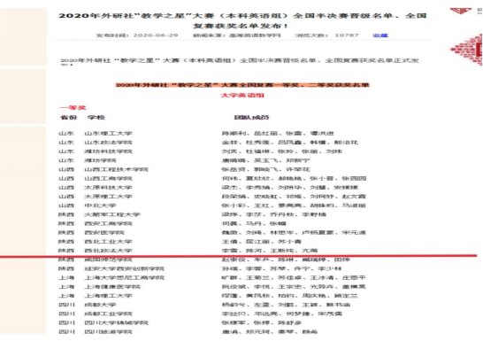 7月1日,2020年外研社“教学之星”大赛全国复赛落下帷幕,经过全国通讯专家的多轮在线评审,由我校必赢线路检测3003no1李雪、陈河、亢萌和王斯纯四位老师组成的大学英语参赛团队获得全国复赛一等奖的佳绩。2020年外研社“教学之星”大赛以“语言与育人融合的外语课程与教学设计”为主题,自4月初启动以来,吸引了全国各高校共406组外语教学团队参赛。