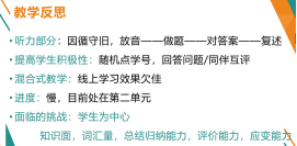 辛娜老师以听说教程第一单元(思政智慧版)为例,全面介绍了混合式教学的定义、教学方法、理论依据和组织形式,并详细讲解了混合式听说课程的实施过程。借助U校园等平台资源及“任务清单”“作业纸”等定制化设计,将线上线下教与学有机衔接,学生兴趣浓、积极性高,学习效率、质量均有提升,真正把“以学生为中心、实现深度高效学习”落到实处。辛老师指出要根据学生完成情况,动态调整任务设置,同时要提高课堂管理水平、注意评价的及时性和公平度。