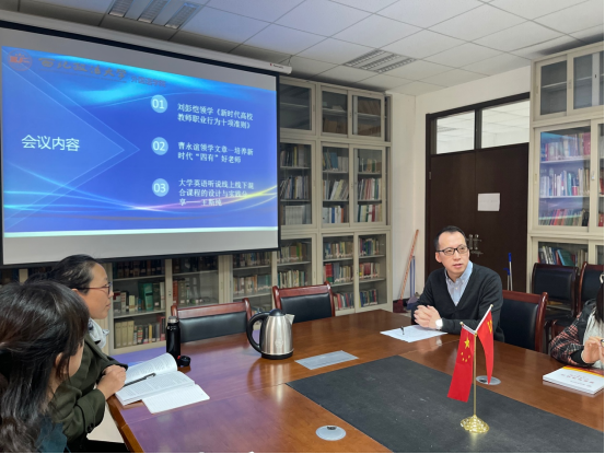 会上,教研室主任刘彭恺老师领学《新时代高校教师职业行为十项准则》,通过典型案例,从政治纪律、学术不端、科研诚信、师德师风等多方面剖析问题并提出工作要求;曹永谊老师领学文章《培养时代“四有”好老师》,引导教师遵守职业道德规范,明确职业行为准则,严明学术纪律,营造求真务实的学术氛围和良好的育人环境;王斯纯老师进行了《基于大学英语听说课程的线上线下混合课程设计与实践》分享,深入探讨了混合课程的概念以及优势,详细展示了高质量混合课程的设计和时间步骤,展示了探索创新型的教学方法。