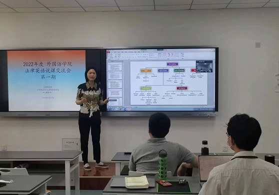 第二期“法律英语教学说课交流会”(6月10日举办)的主题是法律英语教学方法与法律英语教学资源分享。大学英语ESP教研室教师赵瑾介绍了法律英语课堂教学与课堂活动调配经验。大学英语ESP教研室教师张蕊楠以侵权法为例,介绍了学习通与课堂教学间的配合使用。国家安全学院教师闫德华以中美两国刑事诉讼程序差异为示范讲解了中英法律英语在术语表达方面的异同。法律英语系教师付欣分享了法律英语教学与法律翻译实践及专业竞赛三者间的关系。法律英语系教师孟超分享了法律英语教学中的常用网址和教学资源。