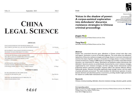 近日,必赢线路检测3003no1法律翻译中心主任付欣副教授、法律语言研究所何静秋教授分别在顶尖外文核心期刊发表论文。付欣在《中国法学》英文版(CLSCI、AMI外文刊核心)发表《中国数据可携带权的发展、挑战与对策》,何静秋及其研究生霍扬,在《DISCOURSE STUDIES》(SSCI2区、JCR Q2)发表《中国刑事诉讼中被告人的话语抵抗策略——基于语料库的探究》)。两项成果集中彰显了学院“外语+法律”交叉学科研究实力。
