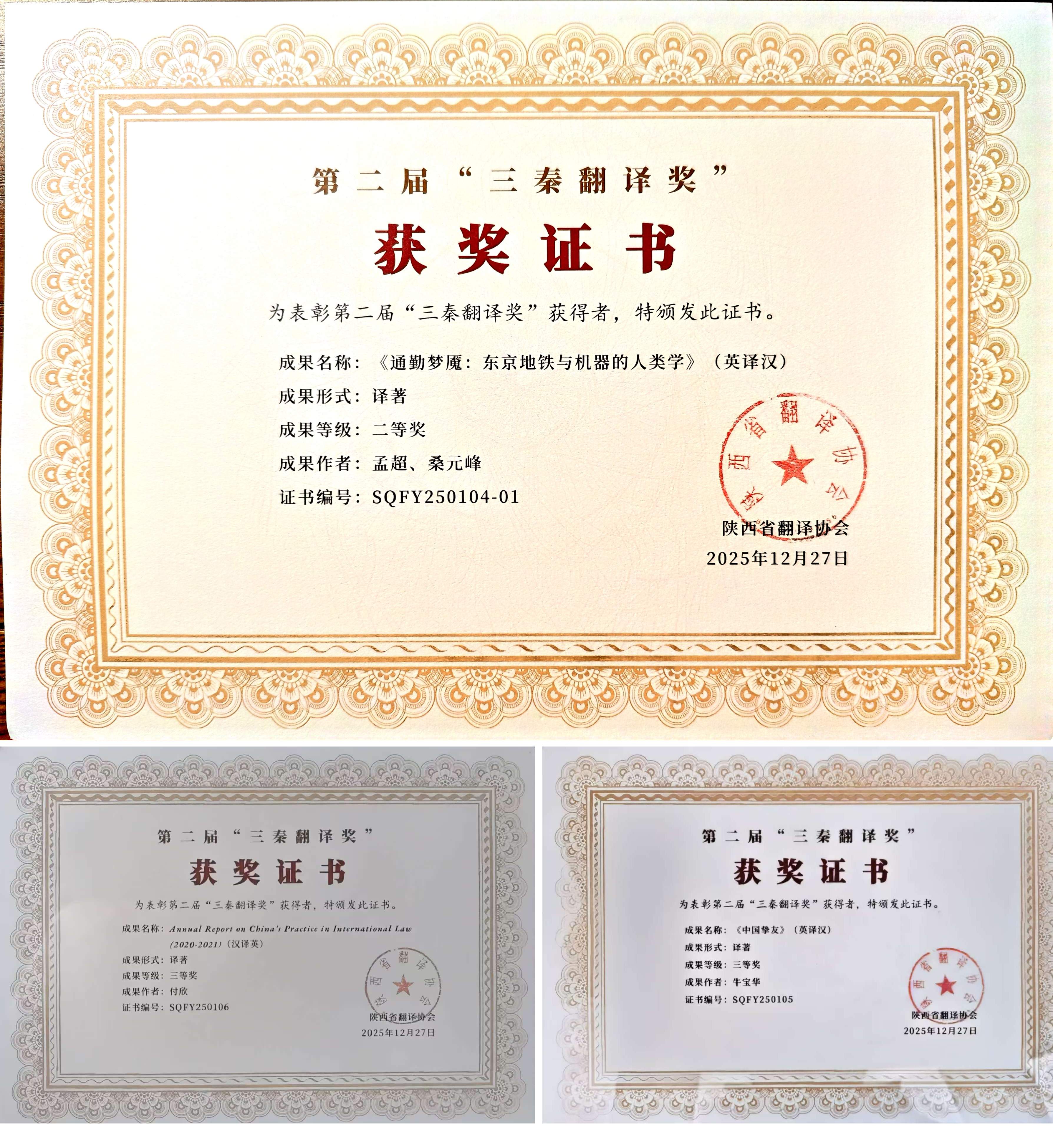 近日,陕西省翻译协会第九届理事会第六次会议暨学术年会正式揭晓第二届“三秦翻译奖”获奖名单,孟超博士合作译著《通勤梦魇:东京地铁与机器的人类学》荣获二等奖,牛宝华副教授合作译著《中国挚友》、付欣副教授译著《Annual Report on China’s Practice in International Law(2020-2021)》荣获三等奖。“三秦翻译奖”是陕西省翻译界的最高奖项,本次获奖彰显了必赢线路检测3003no1在翻译领域的扎实功底。